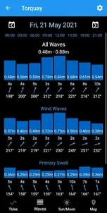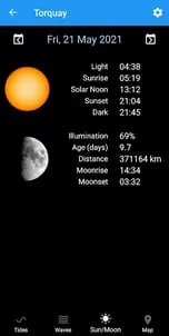 Tidal predictions for over 8500 locations showing high/low tide times, tide curve and current predicted tide height.Sea temperature (2 days) for 7000+ locations.Wave forecast (5+ days) for 5600+ locations.Storm surge forecast (2-3 days) for UK and nearby.Sun/Moon data worldwide.Covers: UK, Europe, Africa, Middle East, North/South America, Asia, Australia, New Zealand and more.Tide predictions based on data from UKHO, HOAA, NTSLF and others.Features:- Search, nearest and recent locations.- Map- Tidal prediction charts.- Current predicted tide height.- Tide predictions from 2015 to 2050 for all locations.- Works completely offline (except for maps, sea temperature, wave forecasts).- No adverts and no in-app purchases.- No personal data collected.Version 6.0- Added wave forecasts.- Added tabs for additional data.- Many minor improvements.Version 5.0- Added sea temperature.- Additional moon information.