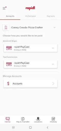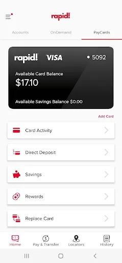 Rapid! Pay is the mobile app that can access all of your rapid! accounts. It combines all of the robust features of the rapid! PayCard program with the power of the rapid! OnDemand/Disbursements platform, ensuring that users can access their earnings when and how they need it instantly. The app enables users to manage PayCards (activate/replace, view balances/transactions), use savings accounts and companion cards, transfer funds, earn cash back, deposit checks remotely. Additionally, it offers